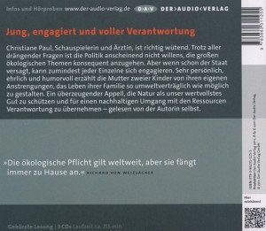 Christiane Paul, Schauspielerin und Ärztin, ist richtig wütend. Trotz aller drängenden Fragen ist die Politik anscheinend nicht willens, die großen ökologischen Themen konsequent anzugehen. Aber wenn schon der Staat versagt, kann zumindest jeder Einzelne sich engagieren. Sehr persönlich, ehrlich und humorvoll erzählt die Mutter zweier Kinder von ihren eigenen Anstrengungen, das Leben ihrer Familie so umweltverträglich wie möglich zu gestalten. Ein überzeugender Appell, die Natur als unser wertvollstes Gut zu schützen und für einen nachhaltigen Umgang mit den Ressourcen Verantwortung zu übernehmen - gelesen von der Autorin selbst.