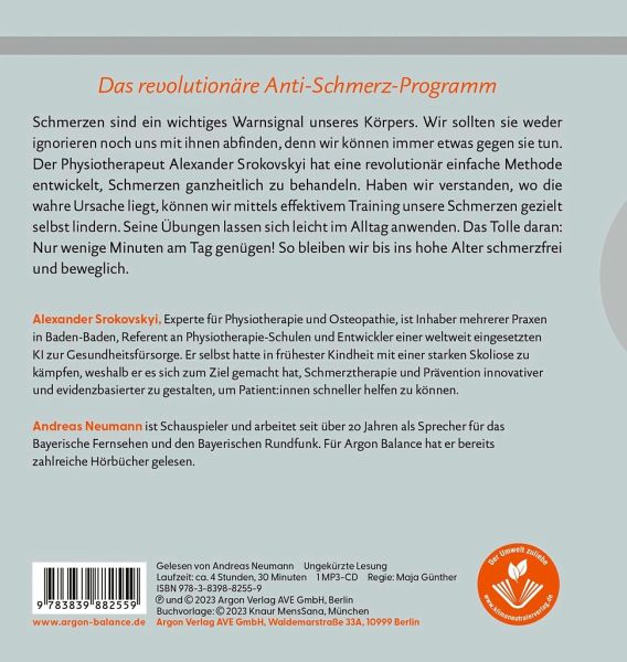 Der Physiotherapeut Alexander Srokovskyi hat eine revolutionär einfache Methode entwickelt, Schmerzen ganzheitlich zu behandeln. Haben wir einmal verstanden, wo die wahre Ursache des Problems liegt, können wir mittels effektivem Training unsere Schmerzen gezielt selbst lindern. Die im Hörbuch vorgestellten Übungen werden genauestens erklärt und lassen sich leicht im Alltag anwenden. Illustrationen veranschaulichen, welche Körperstelle trainiert werden soll. Das Tolle daran: 3 Minuten am Tag genügen! So kann sich jeder selbst das passende Selbsthilfe-Programm zusammenstellen.