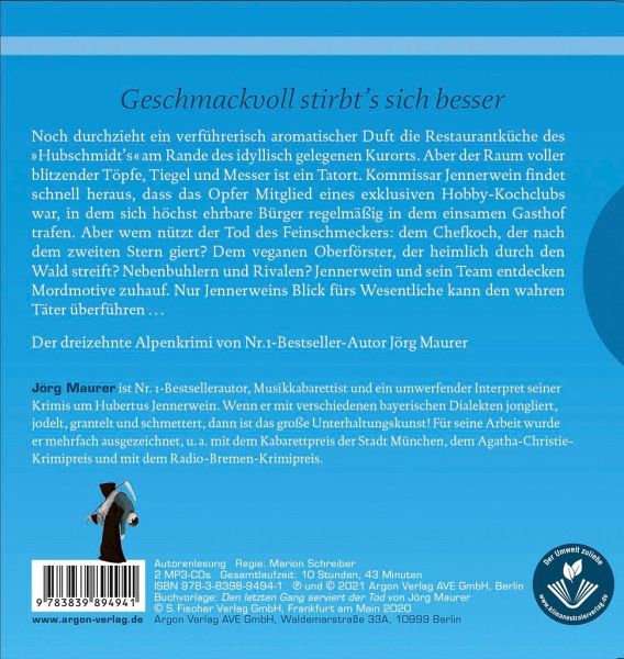 Noch durchzieht ein verführerisch aromatischer Duft die Restaurantküche des »Hubschmidt's« am Rande des idyllisch gelegenen Kurorts. Aber der Raum voller blitzender Töpfe, Tiegel und Messer ist ein Tatort. Kommissar Jennerwein findet schnell heraus, dass das Opfer Mitglied eines exklusiven Hobby-Kochclubs war, in dem sich höchst ehrbare und angesehene Bürger in dem einsamen Gasthof trafen. Aber wem nützt der Tod des Feinschmeckers: dem Chefkoch, der nach dem zweiten Stern giert? Dem veganen Oberförster, der heimlich durch den Wald streift? Nebenbuhlern und Kurort-Rivalen?