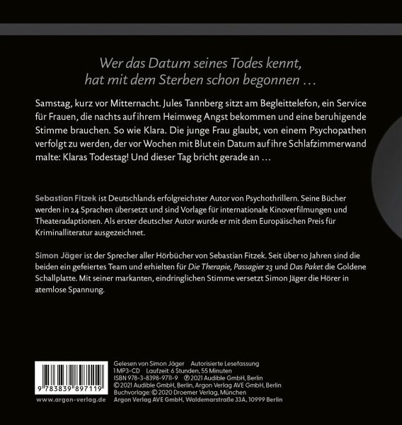 beobachtet. Und sie weiß, dass dieser Mann sie töten wird. Denn er hat mit Blut ihr Todesdatum an die…mehrJules Tannberg arbeitet als ehrenamtliches Mitglied am Begleittelefon und hilft Frauen auf ihrem Heimweg in der Nacht, wenn diese alleine sind und sich aufgrund dessen unwohl fühlen. Als eines Abends Klara bei ihm anruft, merkt Jules, dass dies nicht einer dieser "normalen" Anrufe wird. Klara wird beobachtet. Und sie weiß, dass dieser Mann sie töten wird. Denn er hat mit Blut ihr Todesdatum an die Wand geschrieben. Und dieses Datum beginnt in zwei Stunden.