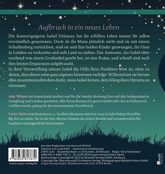 Jojo Moyes hat es auch mit diesem Buch, welches eine überarbeitete Neuausgabe von 2010 ist, auch wieder geschafft, mich als Leserin vollkommen in allen Details zu überzeugen! Das Buch ist in leichtem Schreibstil, sehr spannend und absolut fesselnd geschrieben und die einzelnen Protagonisten so detailgetreu erzählt, das man glaubt sie vor sich zu sehen. Ich konnte das Buch kaum aus der Hand legen, da immer wieder Spannung eingebracht wurde, und ich unbedingt wissen musste, wie es weiter geht:-) Die einzelnen Kapitel in sich abschließend und immer wieder wechselnd erzählt, mit Sprüngen, die aber sehr einfach zu kombinieren sind, macht das ganze besonders interessant. Es ist zu keiner Zeit langweilig und man lacht, weint und leidet einfach mit. Das Cover ist absolut stimmig mit der Geschichte, wenn Isabel abends im Mondschein Geige zu spielen beginnt, bekommt man eine Gänsehaut, ja, auch als Leser, denn es ist so einfühlsam beschrieben, als würde die Welt gerade still stehen, alle Tiere des Waldes vor Ehrfurcht zuhören und die ehrlichen Menschen ansprechen. Unglaublich wie man so eine wunderbare Geschichte, die sehr emotional und mit Liebe geschrieben wurde, in Zeilen fassen kann. Auch hier hat Jojo Moyes es wieder geschafft mich in den Bann ihres Buches zu ziehen, von der ersten Zeile an, es wurde zu keinem Zeitpunkt langweilig und man hatte tatsächlich auch das Gefühl vor Ort dabei zu sein. Ich stelle mir das so vor, als wäre ich eine kleine Maus unter dem Tisch oder als Leser auf dem Dachboden:-) Das Buch erzählt vom kleinen Glück, der großen Liebe und vertanen Zeiten, von Erwachen, Zusammenhalt & Zusammengehörigkeit, von Trauer & Wut, hier sind im Grunde alle Emotionen in eine Geschichte phänomenal verpackt, nicht übertrieben, jedoch so, wie es im wirklichen Leben tatsächlich passieren könnte und wie viele das Leben so erleben müssen und dürfen. Freundschaft und Familie sind hier letztendlich auch groß geschrieben, dies dürfen die Protagonisten, wie auch der Leser lernen. Ein Apell an die Welt, doch die wichtigen Dinge im Leben nicht als selbstverständlich zu nehmen!