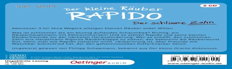 Rapido ist ein kleiner, so liebenswerter Räuberjunge, dass man ihn einfach mögen muss. Er tut sich schwer, ein richtiger Räuberjunge zu werden. Warum das so ist, erfährt man in diesem Buch ganz zum Schluss. Wir haben die Abenteuer, in die er durch die Suche nach einem Ausweg aus den Zahnschmerzen seines Papas erlebt, richtig genossen. Kleine Alltagsweisheiten werden durch ihn gut an den kleinen Leser gebracht.