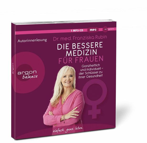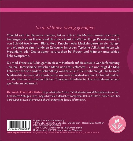 Dr. med. Franziska Rubin macht für dieses Hörbuch einen Streifzug durch die bahnbrechenden Erkenntnisse der Gendermedizin und schaut, wie dieses Wissen die moderne Behandlung von Frauen bereits bereichern könnte. Darüber hinaus empfiehlt die Expertin für Naturheilkunde ganzheitliche Behandlungsansätze für Frauen. Denn ihr Credo ist: die bessere Medizin für Frauen ist die Kombination aus einer individualisierten Hochschulmedizin mit den besten naturheilkundlichen Therapien.