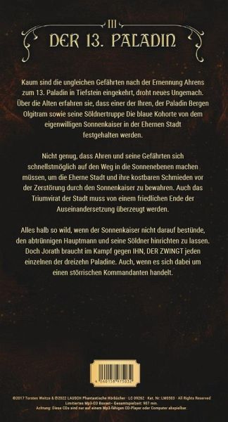 ___Die große Erfolgsserie von Torsten Weitze - Der 13. Paladin - erstmals auf CD!"Den ungleichen Gefährten droht neues Ungemach. Über die Alten erfahren sie, dass einer der Ihren, der Paladin Bergen Olgitram, vom Sonnenkaiser in der Ehernen Stadt festgehalten wird. Nicht genug, dass Ahren und seine Gefährten sich schnellstmöglich auf den Weg in die Sonnenebenen machen müssen, um die Eherne Stadt und ihre kostbaren Schmieden vor der Zerstörung durch den Sonnenkaiser zu bewahren, auch das Triumvirat der Stadt muss von einem friedlichen Ende der Auseinandersetzung überzeugt werden. Alles halb so wild, wenn der Sonnenkaiser nicht darauf bestünde, Olgitram hinrichten zu lassen. Doch Jorath braucht im Kampf gegen IHN, DER ZWINGT, jeden einzelnen der dreizehn Paladine.