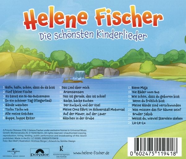 Helene Fischer verzaubert jetzt auch die Kleinsten und überrascht mit einem neuen Projekt! Nun wartet Helene Fischer mit einer der wohl schönsten Überraschungen des Jahres auf: Der Superstar wird unter dem Titel Die schönsten Kinderlieder eine eigene brandneue Serie mit einer von ihr handverlesenen Auswahl der schönsten und wundervollsten Kinderlieder herausbringen. Mit der Veröffentlichung dieser besonderen Reihe erfüllt sich Helene einen Traum, den sie schon lange in ihrem Herzen trägt. Mit ihrer neuen Serie Die schönsten Kinderlieder nimmt Dich Helene Fischer mit in eine Welt voller Musik und Freude. Ab 1. November wird's bunt und musikalisch: Die 25 schönsten Klassiker, neu interpretiert - Ein Muss für jedes Kinderzimmer, für Klein und Groß. Die schönsten Kinderlieder ist Helenes Einladung von Herzen an ihre zukünftigen kleinen und natürlich auch großen Fans, mit ihr gemeinsam in ihre perfekte kleine heile Welt einzutauchen und dort eine durch und durch kurzweilige, auf- wie anregende und sogar pädagogisch wertvolle Zeit zu haben. Helene Fischer: Die schönsten Kinderlieder! Jetzt vorbestellen und aus einer Auswahl an verschiedenen Produkten bestellen.