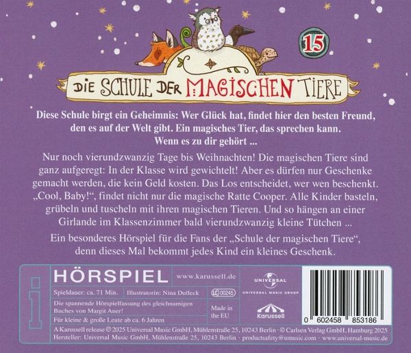 Die spannende Hörspielfassung des gleichnamigen Bucherfolgs von Margit Auer! Diese Schule birgt ein Geheimnis: Wer Glück hat, findet hier den besten Freund, den es auf der Welt gibt. Ein magisches Tier, das sprechen kann! Wenn es zu dir gehört Nur noch vierundzwanzig Tage bis Weihnachten! Die magischen Tiere sind ganz aufgeregt: In der Klasse wird gewichtelt! Aber es dürfen nur Geschenke gemacht werden, die kein Geld kosten. Das Los entscheidet, wer wen beschenkt. Cool, Baby!, findet nicht nur die magische Ratte Cooper. Alle Kinder basteln, grübeln und tuscheln mit ihren magischen Tieren. Und so hängen an einer Girlande im Klassenzimmer bald vierundzwanzig kleine Tütchen ... Ein besonderes Hörspiel für die Fans der Schule der magischen Tiere, denn dieses Mal bekommt jedes Kind ein kleines Geschenk. Spieldauer: ca. 71 Minuten Empfohlen für kleine und große Leute ab 6 Jahren