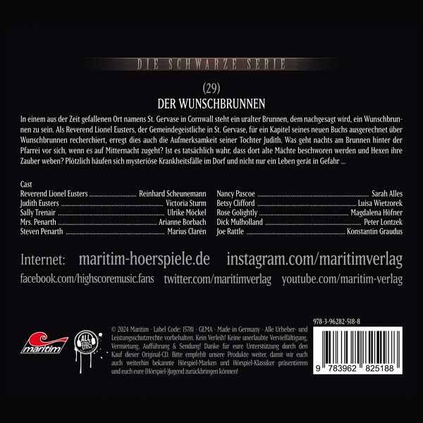 Vorsicht, schwarze Magie: Ob ein verfluchtes Grab in Ägypten, ein Vampir in England, ein Teufelselixier in Italien oder eine Sagengestallt in Wäldern Kanadas - Grusel ist garaniert! Die schwarzen Serie, eine packende Hörspiel-Sammlung der Horror- und Schauerliteratur! In einem aus der Zeit gefallenen Ort namens St. Gervase in Cornwall steht ein uralter Brunnen, dem nachgesagt wird, ein Wunschbrunnen zu sein. Als Reverend Lionel Eusters, der Gemeindegeistliche in St. Gervase, für ein Kapitel seines neuen Buchs ausgerechnet über Wunschbrunnen recherchiert, erregt dies auch die Aufmerksamkeit seiner Tochter Judith. Was geht nachts am Brunnen hinter der Pfarrei vor sich, wenn es auf Mitternacht zugeht? Ist es tatsächlich wahr, dass dort alte Mächte beschworen werden und Hexen ihre Zauber weben? Plötzlich häufen sich mysteriöse Krankheitsfälle im Dorf, und nicht nur ein Leben gerät in Gefahr.