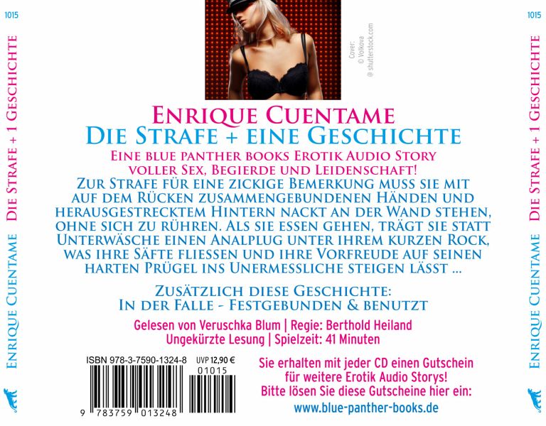 Zur Strafe für eine zickige Bemerkung muss sie mit auf dem Rücken zusammengebundenen Händen und herausgestrecktem Hintern nackt an der Wand stehen, ohne sich zu rühren. Als sie essen gehen, trägt sie statt Unterwäsche einen Analplug unter ihrem kurzen Rock, was ihre Säfte fließen und ihre Vorfreude auf seinen harten Prügel ins Unermessliche steigen lässt ...Gelesen von Veruschka BlumRegie: Berthold HeilandUngekürzte LesungSpielzeit: 41 MinutenDiese Ausgabe ist vollständig, unzensiert und enthält keine gekürzten erotischen Szenen.