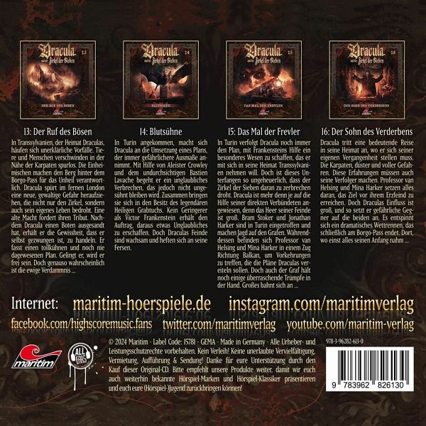 Die 4 finalen Folgen über den Fürsten der Finsternis in einer Sammelbox. Folge 13: In Transsylvanien, der Heimat Draculas, häufen sich unerklärliche Vorfälle. Tiere und Menschen verschwinden in der Nähe der Karpaten spurlos. Die Einheimischen machen den Berg hinter dem Borgo-Pass für das Unheil verantwortlich. Dracula spürt im fernen London eine neue, gewaltige Gefahr heraufziehen, die nicht nur den Zirkel, sondern auch sein eigenes Leben bedroht. Eine alte Macht fordert ihren Tribut. Nachdem Dracula einen Boten ausgesandt hat, erhält er die Gewissheit, dass er selbst gezwungen ist, zu handeln. Er fasst einen tollkühnen und noch nie dagewesenen Plan. Gelingt er, wird er frei sein. Doch genauso wahrscheinlich ist die ewige Verdammnis ...