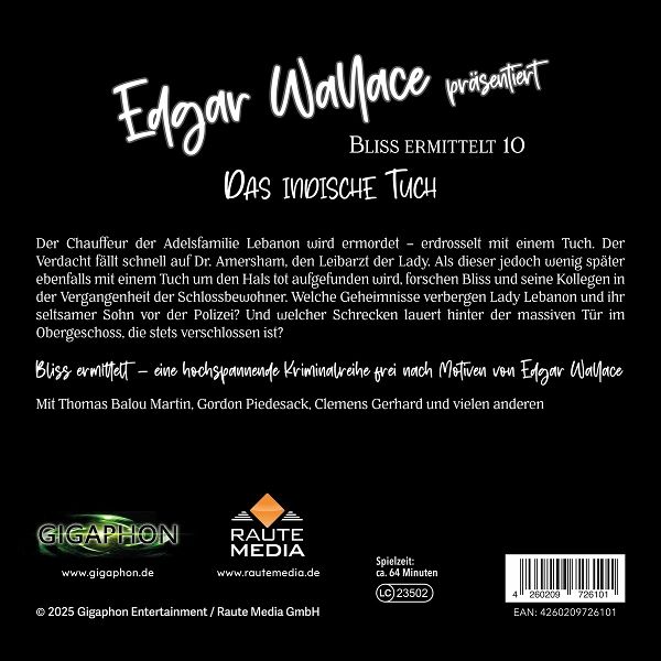 Bliss ermittelt - eine hochspannende Kriminalreihe frei nach Motiven von Edgar Wallace. Der Chauffeur der Adelsfamilie Lebanon wird ermordet - erdrosselt mit einem Tuch. Der Verdacht fällt schnell auf Dr. Amersham, den Leibarzt der Lady. Als dieser jedoch wenig später ebenfalls mit einem Tuch um den Hals tot aufgefunden wird, forschen Bliss und seine Kollegen in der Vergangenheit der Schlossbewohner. Welche Geheimnisse verbergen Lady Lebanon und ihr seltsamer Sohn vor der Polizei? Und welcher Schrecken lauert hinter der massiven Tür im Obergeschoss, die stets verschlossen ist?