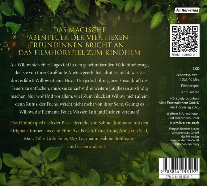 Als Willow sich eines Tages tief in den geheimnisvollen Wald hineinwagt, den sie von ihrer Großtante Alwina geerbt hat, ahnt sie nicht, was sie dort erfährt: Willow ist eine Hexe! Um jedoch ihre ganze Hexenkraft des Feuers zu entfachen, muss sie zunächst drei weitere Junghexen ausfindig machen. Nur wo? Und vor allem, wie? Zum Glück ist Willow nicht allein, denn Rufus, der Fuchs, weicht nicht mehr von ihrer Seite. Gelingt es Willow, die Elemente Feuer, Wasser, Luft und Erde zu vereinen?