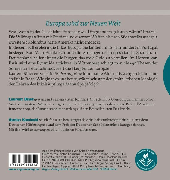 Wikinger noch vor Kolumbus Südamerika entdeckt hätten und die Inkas sich gen Osten aufgemacht hätten, um…mehrWir alle haben sie studiert, die Geschichte Europas und die Eroberung der Welt. Mutige Männer, die dahinsegelten, um ferne Länder zu entdecken und zu unterwerfen, um ihnen die zivilisierte Hochkultur der alten Welt nahezubringen. Was aber wäre gewesen, wenn alles ganz anders verlaufen wäre? Die Wikinger noch vor Kolumbus Südamerika entdeckt hätten und die Inkas sich gen Osten aufgemacht hätten, um erst Portugal und dann ganz Europa zu unterwerfen? So manch ein Herrscher hätte nicht schlecht gestaunt, ebenso die Vertreter der Heiligen Kirche – und deren Gegner. Ein fuchsteufelswilder Luther muss zusehen, wie statt seiner Thesen die Kunde des Sonnengottes angeschlagen und damit der neue Glaube besiegelt wird.
