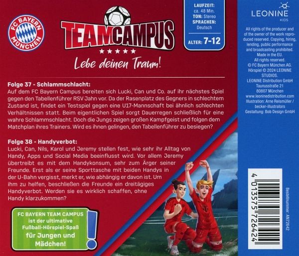 Folge 37: Schlammschlacht Auf dem FC Bayern Campus bereiten sich Lucki, Can und Co. auf ihr nächstes Spiel gegen den Tabellenführer RSV Jahn vor. Da der Rasenplatz des Gegners in schlechtem Zustand ist, findet ein Testspiel gegen eine U17-Mannschaft bei ähnlich schlechten Verhältnissen statt. Beim eigentlichen Spiel sorgt Dauerregen schließlich für eine wahre Schlammschlacht. Doch die Jungs zeigen großen Kampfgeist und folgen dem Matchplan ihres Trainers. Wird es ihnen gelingen, den Tabellenführer zu besiegen? Folge 38: Handyverbot Lucki, Can, Nils, Karol und Jeremy stellen fest, wie sehr ihr Alltag von Handy, Apps und Social Media beeinflusst wird. Vor allem Jeremy übertreibt es mit dem Handykonsum, sehr zum Ärger seiner Freunde. Erst als er seine Sporttasche mit beiden Handys in der U-Bahn vergisst, merkt er, wie abhängig er davon ist. Um ihm zu helfen, beschließen die Freunde ein dreitägiges Handyverbot. Werden sie es wirklich schaffen, ohne Handy klarzukommen?