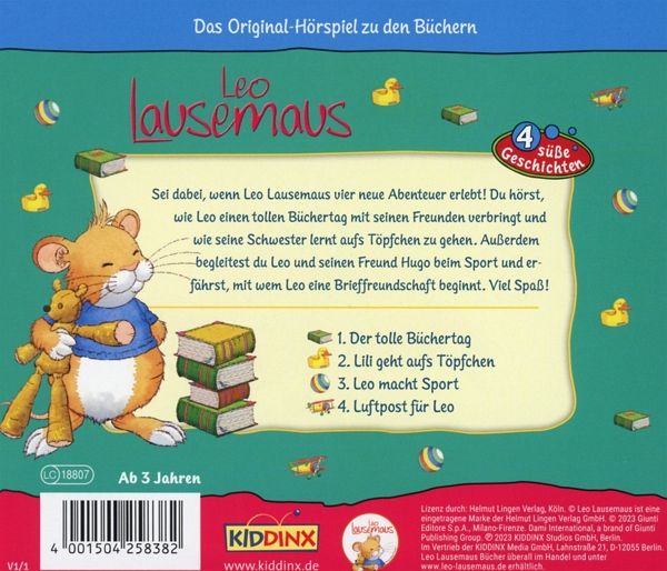 Sei dabei, wenn Leo Lausemaus vier neue Abenteuer erlebt! Du hörst, wie Leo einen tollen Bü chertag mit seinen Freunden verbringt und wie seine Schwester lernt aufs Töpfchen zu gehen. Außerdem begleitest du Leo und seinen Freund Hugo beim Sport und erfährst, mit wem Leo eine Brieffreundschaft beginnt. Viel Spaß!