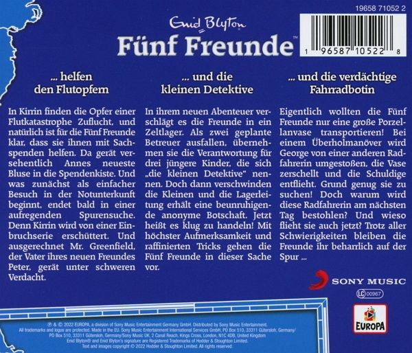 Fünf Freunde helfen den FlutopfernŤ (Folge: 115): In Kirrin finden die Opfer einer Flutkatastrophe Zuflucht, und natürlich ist für die Fünf Freunde klar, dass sie ihnen mit Sachspenden helfen. Da gerät versehentlich Annes neueste Bluse in die Spendenkiste. Und was zunächst als einfacher Besuch in der Notunterkunft beginnt, endet bald in einer aufregenden Spurensuche. Denn Kirrin wird von einer Einbruchserie erschüttert. Und ausgerechnet Mr. Greenfield, der Vater ihres neuen Freundes Peter, gerät unter schweren Verdacht. Fünf Freunde und die kleinen DetektiveŤ (Folge: 129): In ihrem neuen Abenteuer verschlägt es die Freunde in ein Zeltlager. Als zwei geplante Betreuer ausfallen, übernehmen sie die Verantwortung für drei jüngere Kinder, die sich ťdie kleinen DetektiveŤ nennen. Doch dann verschwinden die Kleinen und die Lagerleitung erhält eine beunruhigende anonyme Botschaft. Jetzt heißt es klug zu handeln! Mit höchster Aufmerksamkeit und raffinierten Tricks gehen die Fünf Freunde in dieser Sache vor. Und mit der Hilfe der schlauen Kinder wird schließlich einer gemeinen Bande das Handwerk gelegt. Fünf Freunde und die verdächtige FahrradbotinŤ (Folge: 146): Eigentlich wollten die Fünf Freunde nur eine große Porzellanvase transportieren! Bei einem Überholmanöver wird George von einer anderen Radfahrerin umgestoßen, die Vase zerschellt und die Schuldige entflieht. Grund genug sie zu suchen! Doch warum wird diese Radfahrerin am nächsten Tag bestohlen? Und wieso flieht sie auch jetzt? Trotz aller Schwierigkeiten bleiben die Freunde ihr beharrlich auf der Spur und stoßen dabei auf einen höchst gefährlichen Betrug.