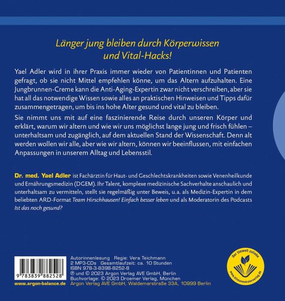 Wir können es nicht ändern, dass wir älter werden - aber wir können sehr wohl etwas daran ändern, wie dies geschieht. Als Hautärztin, Ernährungsmedizinerin und Anti-Aging-Spezialistin wird Yael Adler fast täglich nach den ultimativen Maßnahmen oder Produkten gefragt, die das Altern aufhalten. In ihrem neuen Hörbuch nimmt sie uns mit auf eine spannende Reise durch unseren Körper und erklärt, wie und warum wir von der einzelnen Zelle bis zu den Organen altern - und was wir ganz konkret dagegen tun können, und zwar jeder von uns im Allgemeinen wie an seinen ganz individuellen Schwachstellen. Durch teils ganz einfache Umstellungen von Ernährung oder Lebensstil können wir nämlich deutlich länger jung bleiben. Detektivisch spürt Yael Adler die Altersbeschleuniger auf, hilft uns, rundum länger fit zu bleiben und liefert verblüffende Tipps zur »Instandhaltung« unseres Körpers.