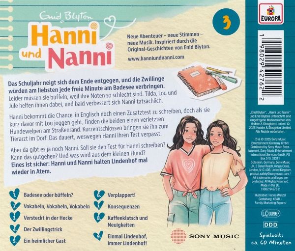 Das Schuljahr neigt sich dem Ende entgegen und die Zwillinge würden am liebsten jede freie Minute am Badesee verbringen. Leider müssen sie büffeln, weil ihre Noten so schlecht sind. Tilda, Lou und Jule helfen ihnen dabei und bald verbessert sich Nanni tatsächlich. Hanni bekommt die Chance, in Englisch noch einen Zusatztest zu schreiben, doch als sie kurz davor mit Lou Joggen geht, finden die beiden einen verletzten Hundewelpen am Straßenrand. Kurzentschlossen bringen sie ihn zum Tierarzt im Dorf. Das dauert, weswegen Hanni ihren Test verpasst. Aber da gibt es ja noch Nanni. Soll sie den Test für Hanni schreiben? Kann das gutgehen? Und was wird aus dem kleinen Hund? Eines ist sicher: Hanni und Nanni halten Lindenhof mal wieder in Atem.
