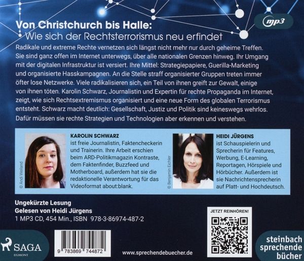 Radikale und extreme Rechte vernetzen sich längst nicht mehr nur durch geheime Treffen. Sie sind ganz offen im Internet unterwegs, über alle nationalen Grenzen hinweg. Ihr Umgang mit der digitalen Infrastruktur ist versiert. Ihre Mittel: Strategiepapiere, Guerilla-Marketing und organisierte Hasskampagnen. An die Stelle straff organisierter Gruppen treten immer öfter lose Netzwerke. Viele radikalisieren sich, ein Teil von ihnen greift zur Gewalt, einige von ihnen töten. Karolin Schwarz, Journalistin und Expertin für rechte Propaganda im Internet, zeigt, wie sich Rechtsextremismus organisiert und eine neue Form des globalen Terrorismus entsteht. Schwarz macht deutlich: Gesellschaft, Justiz und Politik sind keineswegs wehrlos.