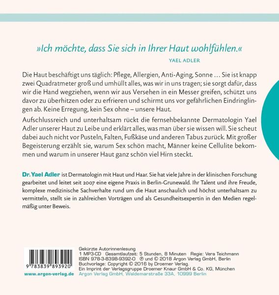 Die Leser erfahren, warum es unterschiedliche Hautfarben gibt, warum Frauen von Cellulite betroffen sind und warum Hautcremes keine Falten wegzaubern können. Ihre Wirkstoffe gelangen dank Hautbarriere gar nicht da hin, wo sie hin müssten, um Falten zu straffen. Auch neigen die Menschen dazu, sich zu viel zu waschen und zu oft zu duschen mit der Folge, dass die Haut sehr belastet wird.