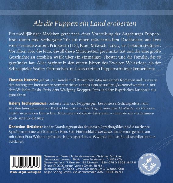 »Das Sprecherduo Valery Tscheplanowa und Christian Brückner erwecken die Augsburger Puppenkiste so zauberhaft wie fesselnd zum Leben. Deren Lesung ist absolut preisverdächtig, definitiv das Beste vom Besten für die Ohren. Nichts begeistert mehr!« Susann Fleischer literaturmarkt.info 20201012