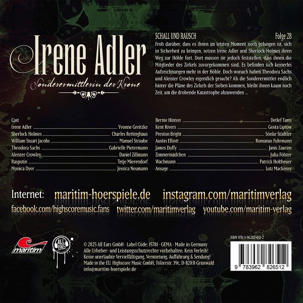 Was Sherlock Holmes kann, kann Irene Adler schon lange! Froh darüber, dass es ihnen im letzten Moment noch gelungen ist, sich in Sicherheit zu bringen, setzen Irene Adler und Sherlock Holmes ihren Weg zur Höhle fort. Dort müssen sie jedoch feststellen, dass ihnen die Mitglieder des Zirkels zuvorgekommen sind. Es befinden sich keinerlei Aufzeichnungen mehr in der Höhle. Doch wonach haben Theodora Sachs und Aleister Crowley eigentlich gesucht? Als die Sonderermittler endlich hinter die Pläne des Zirkels der Sieben kommen, bleibt ihnen kaum noch Zeit, um die drohende Katastrophe abzuwenden...