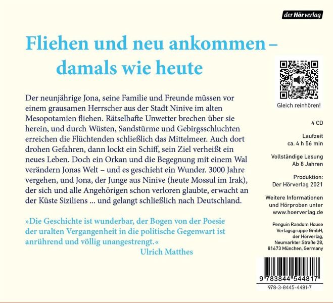 Der neunjährige Jona, seine Familie und Freunde müssen vor einem grausamen Herrscher aus der Stadt Ninive im alten Mesopotamien fliehen. Rätselhafte Unwetter brechen über sie herein, und durch Wüsten, Sandstürme und Gebirgsschluchten erreichen die Flüchtenden schließlich das Mittelmeer. Auch dort drohen Gefahren, dann lockt ein Schiff, sein Ziel verheißt ein neues Leben. Doch ein Orkan und die Begegnung mit einem Wal verändern Jonas Welt - und es geschieht ein Wunder. 3000 Jahre vergehen, und Jona, der Junge aus Ninive (heute Mossul im Irak), der sich und alle Angehörigen schon verloren glaubte, erwacht an der Küste Siziliens ...