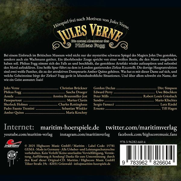 Seit seiner Reise 'In 80 Tagen um die Welt' genießt Phileas Fogg den Ruf als unerschrockener Abenteurer! Bei einem Einbruch im Britischen Museum wird nicht nur der mysteriöse schwarze Spiegel des Magiers John Dee gestohlen, sondern auch ein Wachmann getötet. Ein überlebender Zeuge spricht von einer weißen Bestie, die den Mann umgebracht haben soll. Phileas Fogg nimmt sich des Falls an und beschließt, das gestohlene Artefakt wieder aufzuspüren und nebenbei den Mord aufzuklären. Eine heiße Spur führt zu dem in London gastierenden Zirkus Riccotelli. Die dortige Hauptattraktion sind zwei weiße Panther, die zu der attraktiven Dompteurin Amber Quinn gehören. Was hat es mit dieser Dame auf sich, und welche Geheimnisse birgt der Zirkus? Fogg gerät in lebensbedrohliche Situationen. Und über allem schwebt ein Name, der wie ein Geist anmutet: Isais!