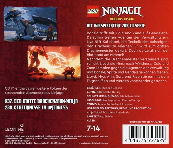 | 13 | LEGO Ninjago (CD 74): Der dritte Drachenzahn-Ninja (Folge 237) / Geheimnisse in Wyldness (Folge 238) | 00:03:01 | |