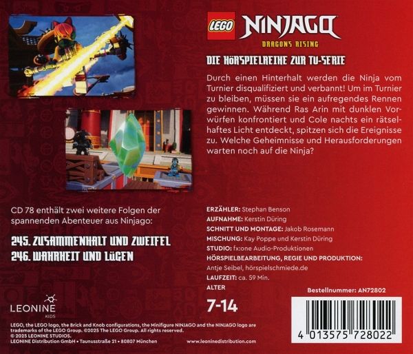 | 14 | LEGO Ninjago (CD 78): Zusammenhalt und Zweifel (Folge 245) / Wahrheit und Lügen (Folge 246) | 00:03:02 | |