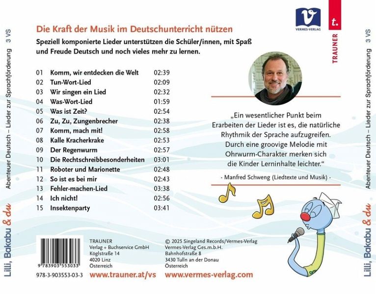 Musik und Bewegung sind bei "Lilli, Bakabu & du" die verlässlichen Partner auf dem Weg zum Lernerfolg. Der musikalische Ohrwurm Bakabu hilft, die Kraft der Musik für den Deutschunterricht zu nützen. Die 15 speziell komponierten Lieder zur Sprachförderung unterstützen Schüler:innen ab der 3. Klasse dabei, mit Spaß und Freude Deutsch und noch vieles mehr zu lernen. Dabei haben die Bakabu-Songs von Manfred Schweng garantiert den Ohrwurm-Effekt, und gesungener Text bleibt länger und leichter im Gedächtnis. Durch die groovigen Melodien merken sich die Kinder Lerninhalte leichter. Ein wesentlicher Punkt beim Erarbeiten der Lieder ist es auch, die natürliche Rhythmik der Sprache aufzugreifen. Die perfekt auf den Deutsch-Lehrstoff abgestimmten Lieder helfen Kindern, die Wort- bzw. Satzmelodien zu lernen. Gesang und Rhythmus der Bakabu-Songs regen die Gehirnaktivität an. Musik unterstützt den Lernprozess - das ist wissenschaftlich erwiesen! Effektiv wird auch die Sprache beim Mitsingen automatisch gefördert.