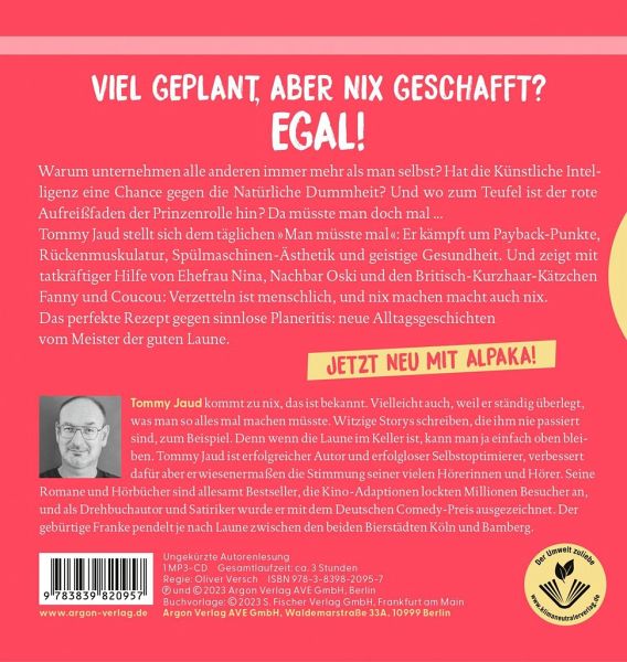Tommy Jaud stellt sich dem täglichen »Man müsste mal«: Er kämpft um Payback-Punkte, Rückenmuskulatur, Spülmaschinen-Ästhetik und geistige Gesundheit. Und zeigt mit tatkräftiger Hilfe von Ehefrau Nina, Nachbar Oski und den Britisch-Kurzhaar-Kätzchen Fanny und Coucou: Verzetteln ist menschlich, und nix machen macht auch nix.