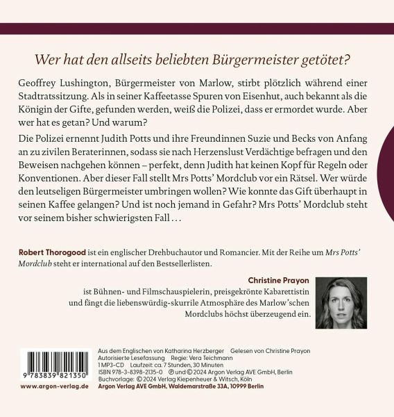 Die Schauspielerin und Kabarettistin Christine Prayon präsentiert den Krimi mit angenehmer Stimme und fesselnder Erzählweise. Prayons ruhiger Vortragsstil ermöglicht es, mühelos in die Handlung einzutauchen. Ihre Interpretation der verschiedenen Charaktere, insbesondere der exzentrischen Mitglieder des Mordclubs, ist sehr lebendig und überzeugend. Geschickt passt sie Betonung und Sprechtempo an die jeweilige Szene an und gestaltet die Dialoge durch stimmliche Variationen abwechslungsreich und lebendig. Obwohl das Grundtempo etwas gemächlich ist, kann dies durch Anpassung der Wiedergabegeschwindigkeit leicht ausgeglichen werden. Insgesamt ist die Hörbuchfassung dank gekonnter Interpretation des Wohlfühlkrimis äußerst unterhaltsam!