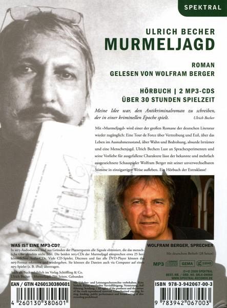 Mit "Murmeljagd" wird einer der großen Romane der deutschen Literatur wieder zugänglich: Eine Tour de Force über Vertreibung und Exil, über das Leben im Ausnahmezustand, über Wahn und Bedrohung, absurde Irrtümer und eine Menschenjagd. Ulrich Bechers Lust an Sprachexperimenten und seine Vorliebe für ausgefallene Charaktere lässt der bekannte und mehrfach ausgezeichnete Schauspieler Wolfram Berger mit seiner unverwechselbaren Stimme in einzigartiger Weise aufleben. Ein Hörbuch der Extraklasse!