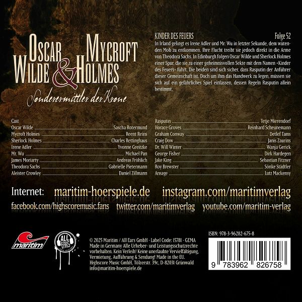 Ein spannendes und fesselndes Hörspiel-Erlebnis! In Irland gelingt es Irene Adler und Mr. Wu in letzter Sekunde, dem wütenden Mob zu entkommen. Ihre Flucht treibt sie jedoch direkt in dieArme von Theodora Sachs. In Edinburgh folgen Oscar Wilde und Sherlock Holmes einer Spur, die sie zu einer geheimnisvollen Sekte mit dem Namen "Kinder des Feuers" führt. Die beiden sind sich sicher, dass Rasputin der Anführer dieser Gemeinschaft ist. Doch um ihm das Handwerk zu legen, müssen sie sich auf ein gefährliches Spiel einlassen, dessen Regeln Rasputin allein bestimmt.