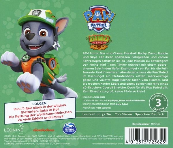 | 12 | PAW Patrol (CD 74): Mini-T-Rex allein in der Wildnis / Elefanten-Baby in Not / Die Rettung der Weltraum-Steinchen... | 00:03:03 | |