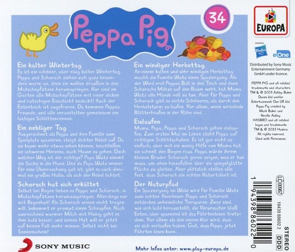 Peppa Pig (34) - ťEin kalter WintertagŤ und 5 Weitere Geschichten 1. Ein kalter Wintertag 2. Ein nebliger Tag 3. Schorsch hat sich erkältet 4. Ein windiger Herbsttag 5. Eislaufen 6. Der Naturpfad Ein kalter Wintertag Es ist ein schöner, aber eisig kalter Wintertag. Peppa und Schorsch ziehen sich ganz besonders warm an, denn sie wollen draußen in den Matschepfützen herumspringen. Nur sind im Garten alle Matschepfützen mit einer dicken und rutschigen Eisschicht bedeckt! Auch der Ententeich ist zugefroren. Da kommen Peppas Freunde, und alle veranstalten gemeinsam ein lustiges Schlittenrennen. Ein nebliger Tag Ausgerechnet, als Peppa und ihre Familie zum Spielplatz spazieren, steigt dichter Nebel auf. Da sie kaum mehr etwas sehen können, beschließen sie schweren Herzens nach Hause zu gehen. Doch welcher Weg ist der richtige? Papa Wutz nimmt die Sache in die Hand. Und da Papa Wutz immer für eine Überraschung gut ist, gibt es auch diesmal ein großes Hallo, als sich der Nebel lichtet. Schorsch hat sich erkältet Selbst bei Regen lieben es Peppa und Schorsch, in Matschepfützen herumzuspringen. Allerdings nur mit Regenhut! Als Schorsch seinen nicht tragen will, bekommt er prompt einen Schnupfen. Nach ausreichend warmer Milch mit Honig geht es ihm bald besser und seinen Hut will er jetzt auf keinen Fall mehr missen. Selbst bei Sonnenschein! Ein windiger Herbsttag An einem kalten und sehr windigen Herbsttag macht die Familie Wutz einen Spaziergang. Als der Wind erst Peppas Ball in den Teich und dann Schorschs Mütze auf den Baum weht, hat Mama Wutz alle Hände voll zu tun. Aber für Peppa und Schorsch gibt es nichts Schöneres, als durch den Herbststurm zu laufen. Vor allem, wenn wirbelnde Blätterhaufen in der Nähe sind. Eislaufen Mama, Papa, Peppa und Schorsch gehen Eislaufen. Zum ersten Mal im Leben steht Peppa auf richtigen Schlittschuhen. Es ist gar nicht so einfach, aber mit ein wenig Hilfe von Mama hat sie schnell den Bogen raus.