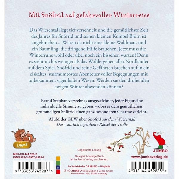 Mit Snöfrid auf gefahrvoller Winterreise: Das Wiesental liegt tief verschneit und die gemütlichste Zeit des Jahres für Snöfrid und seinen kleinen Kumpel Björn ist angebrochen ... Wären da nicht eine kleine Waldmaus und ein Baumling, die dringend Hilfe brauchen. Jetzt muss die Winterruhe wohl oder übel noch ein bisschen warten! Denn es steht nichts weniger als das Wohlergehen aller Nordländer auf dem Spiel. Snöfrid und seine Gefährten brechen auf in ein eiskaltes, sturmumtostes Abenteuer voller Begegnungen mit unbekannten, sagenhaften Wesen. Werden sie den drohenden ewigen Winter abwenden können?