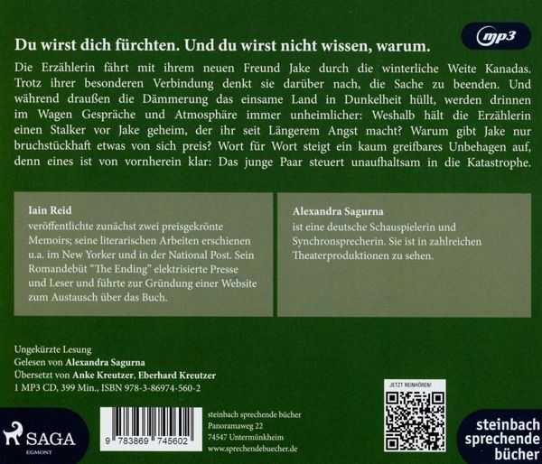 Die Erzählerin fährt mit ihrem neuen Freund Jake durch die winterliche Weite Kanadas. Trotz ihrer besonderen Verbindung denkt sie darüber nach, die Sache zu beenden. Und während draußen die Dämmerung das einsame Land in Dunkelheit hüllt, werden drinnen im Wagen Gespräche und Atmosphäre immer unheimlicher: Weshalb hält die Erzählerin einen Stalker vor Jake geheim, der ihr seit Längerem Angst macht? Warum gibt Jake nur bruchstückhaft etwas von sich preis? Wort für Wort steigt ein kaum greifbares Unbehagen auf, denn eines ist von vornherein klar: Das junge Paar steuert unaufhaltsam in die Katastrophe. Doch was immer Sie jetzt denken - es wird anders kommen. Garantiert.