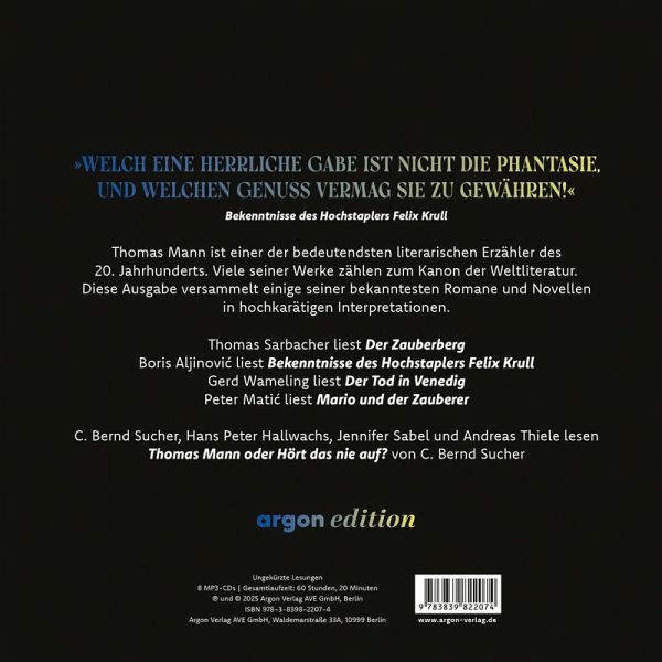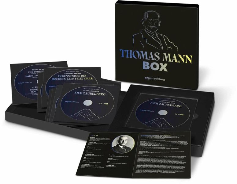 Die Thomas-Mann-Box vereint einige der bedeutendsten Werke des großen Literaten in hochkarätigen Interpretationen. Einmalig wird die Box dadurch, dass Der Zauberberg erstmals in einer ungekürzten Hörbuchfassung zu hören ist.