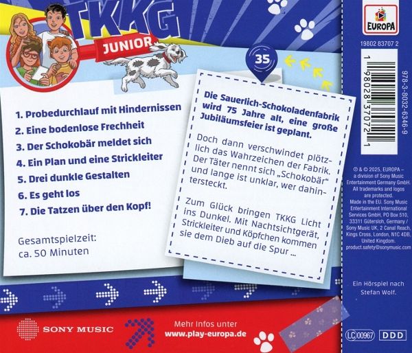 Die Sauerlich-Schokoladenfabrik wird 75 Jahre alt, eine große Jubiläumsfeier ist geplant. Doch dann verschwindet plötzlich das Wahrzeichen der Fabrik. Der Täter nennt sich ťSchokobärŤ und lange ist unklar, wer dahintersteckt. Zum Glück bringen TKKG Licht ins Dunkel. Mit Nachtsichtgerät, Strickleiter und Köpfchen kommen sie dem Dieb auf die Spur...