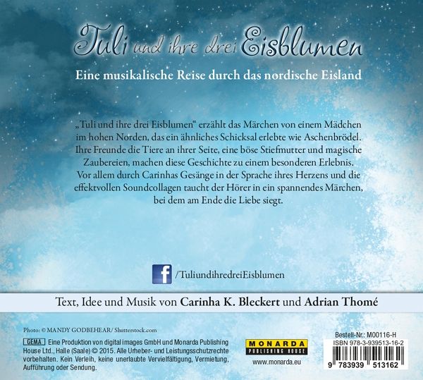"Tuli und ihre drei Eisblumen" erzählt das Märchen von einem Mädchen im hohen Norden, das ein ähnliches Schicksal erlebte wie Aschenbrödel. Ihre Freunde, die Tiere an ihrer Seite, eine böse Stiefmutter und magische Zaubereien machen diese Geschichte zu einem besonderen Erlebnis. Vor allem durch Carinhas Gesänge in der Sprache ihres Herzens und die effektvollen Soundcollagen taucht der Hörer in ein spannendes Märchen, bei dem am Ende die Liebe siegt.
