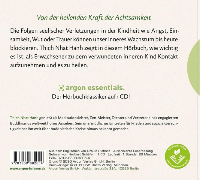 Das Buch "Versöhnung mit dem inneren Kind: Von der heilenden Kraft der Achtsamkeit" des renommierten buddhistischen Mönchs und Lehrers Thich Nhat Hanh ist ein tiefgehendes Werk, das sich mit der Heilung innerer Wunden und der Pflege des inneren Kindes befasst. Thich Nhat Hanh, bekannt für seine Lehren über Achtsamkeit und Mitgefühl, führt den Leser auf eine Reise zur Selbstakzeptanz und inneren Heilung.