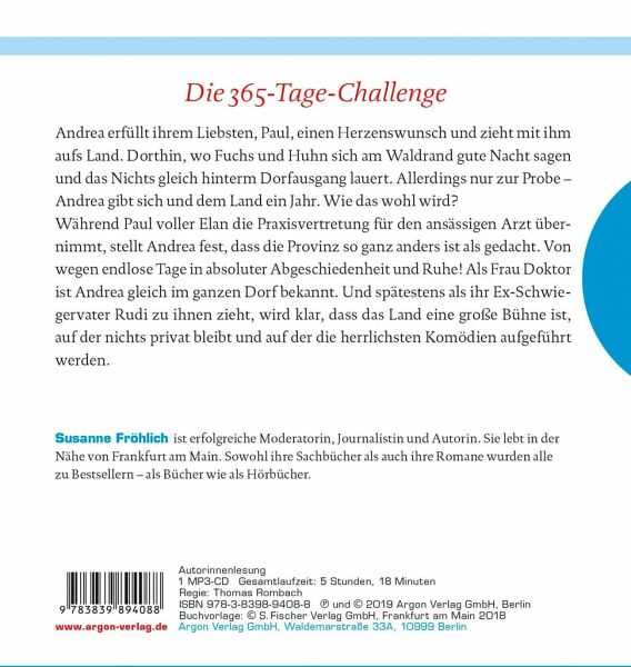 Andrea erfüllt Paul einen Herzenswunsch und zieht mit ihm aufs Land. Und zwar wirklich aufs Land - dahin, wo Fuchs und Hase sich am Waldrand Gute Nacht sagen, der nächste Supermarkt eine halbe Autostunde entfernt ist und die Feldwege sich am Dorfausgang in der Unendlichkeit verlieren. Allerdings nur zur Probe für ein Jahr! Wie das wohl wird? Während Paul voller Elan die Praxisvertretung für den ansässigen Orthopäden übernimmt, muss Andrea feststellen, dass das Landleben gar nicht so ist, wie sie sich das vorgestellt hat: Als Frau Doktor ist sie gleich im ganzen Dorf bekannt, und spätestens als ihr Ex-Schwiegervater Rudi zu ihnen zieht, wird klar, dass von Privatleben hier keine Rede sein kann.
