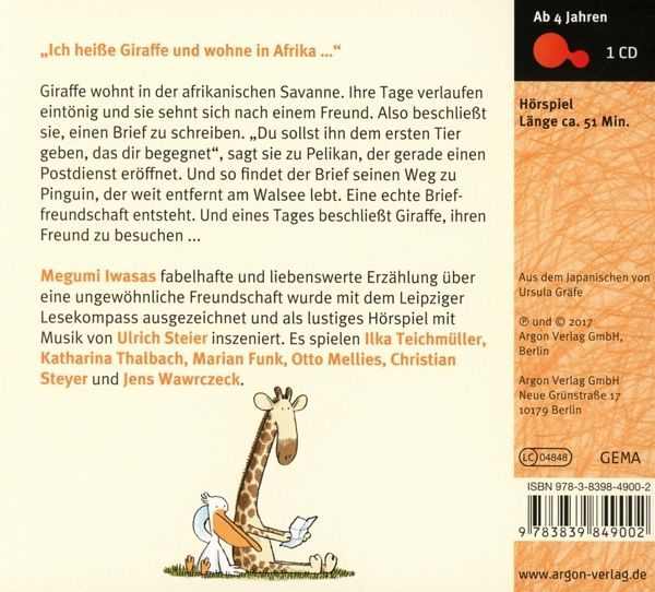 Giraffe wohnt in der afrikanischen Savanne. Ihre Tage verlaufen eintönig und sie sehnt sich nach einem Freund. Also beschließt sie, einen Brief zu schreiben. »Du sollst ihn dem ersten Tier geben, das dir begegnet«, sagt sie zu Pelikan, der gerade, ebenfalls aus Langeweile, einen Postdienst eröffnet. Und so findet der Brief seinen Weg zu Pinguin, der weit entfernt am Walsee lebt. Eine echte Brieffreundschaft entsteht. Und eines Tages beschließt Giraffe, ihren Freund zu besuchen ... und zwar als Pinguin verkleidet.
