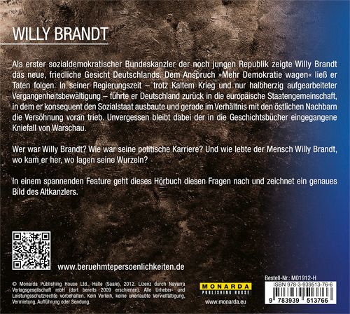 Wer war Willy Brandt? Wie war seine politische Karriere? Und wie lebte der Mensch Willy Brandt, wo kam er her, wo lagen seine Wurzeln? In einem spannenden Feature geht dieses Hörbuch diesen Fragen nach und zeichnet ein genaues Bild des Altkanzlers.