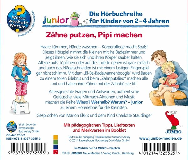 Körperpflege macht Spaß! Wie die Kleinen alleine aufs Töpfchen oder auf die Toilette gehen, wie sie sich richtig die Hände waschen, was beim Haareschneiden passiert und dass Zähneputzen kinderleicht ist, erklärt dieses Hörbuch. Gleichzeitig werden klare und verständliche Antworten darauf gegeben, warum Körperpflege und Hygiene so wichtig sind. Und mit passenden Liedern und Reimen geht alles noch leichter.