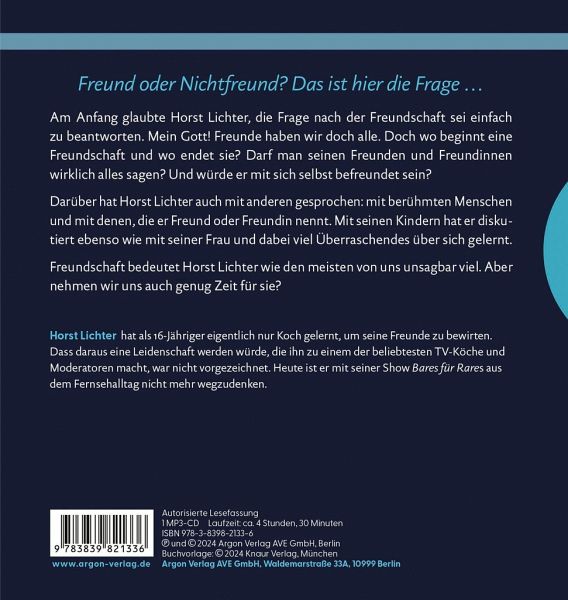 Auch als vielbeschäftigter Erwachsener hat sich Horst Lichter stets Orte geschaffen, an denen er den Menschen nahe sein konnte: ob in seinem Restaurant Oldiethek, im Fernsehstudio der legendären Sendung »Lafer! Lichter! Lecker!« oder heute als Gastgeber des Erfolgsformats »Bares für Rares«. Und doch fragt sich Horst Lichter manchmal: Gibt es überhaupt so etwas wie eine richtige Freundschaft? Und würde er sich selbst als Freund haben wollen?