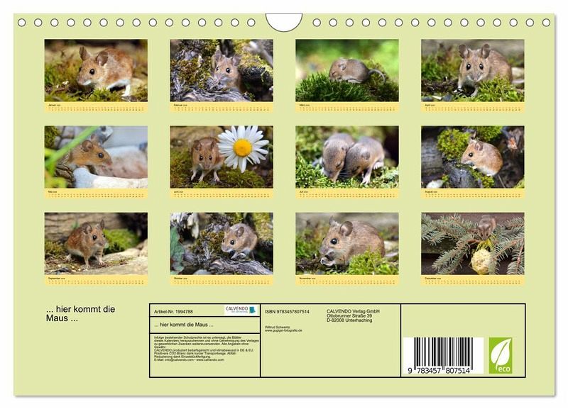 QUALITÄT - Hochwertiger Fotokalender mit 12 wunderschönen Motiven auf lichtbeständigem Bilderdruckpapier, robuste Spiralbindung mit Aufhängebügel.NACHHALTIG - deutliche Abfallreduzierung durch bedarfsgerechte Einzelstückfertigung, umweltfreundliches FSC-zertifiziertes Papier, Produktion in Deutschland, klimabewusste Logistik.PERFEKTES GESCHENK - Kalender für Freunde und Familie, für Kinder und Erwachsene, jung und alt, zu Weihnachten, Geburtstag oder zwischendurch.VIELFALT - Bildkalender in verschiedenen Formaten, z.B. DIN A5, DIN A4, DIN A3 sowie DIN A2. Ob Naturmotiv, Gemälde oder Fotos, ideal für ein persönliches Wohlfühlambiente.Zauberhafte Bilder einer kleinen Maus von Autor(in): GUGIGEI