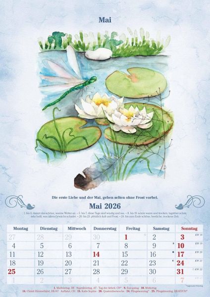 Der nicht nur bei Landwirten beliebte 100-jährige Kalender liefert Ihnen die täglichen Wetterprognosen für das Jahr 2026, ergänzt durch eine eingängige traditionelle Bauernregel zum Monat. Begleitet werden diese nützlichen Informationen von zwölf wundervollen Bildern der Hamburger Illustratorin und Grafikerin Irene Mohr, die Szenen aus dem Landleben zeigen. Seine liebevolle, stets zur Jahreszeit passende Gestaltung macht diesen Wetterkalender zu einem echten Hingucker. Der Kalender im Format von 29,7 x 42 cm (A3) bringt die bezaubernden Bilder hervorragend zur Geltung. Im deutschsprachigen Kalendarium unter den Illustrationen ist ausreichend Platz für Ihre wichtigsten Eintragungen. Das lackierte Deckblatt gibt dem Kalender eine hochwertige Optik, und die praktische Spiralbindung ermöglicht ein einfaches Aufhängen und Umblättern. Der "100-Jährige Kalender 2025" ist genau das Richtige für jeden Fan von traditionellen Weisheiten und eignet sich auch hervorragend als Geschenk für Freunde des Landlebens. Das Team der Neumann-Verlage wünscht Ihnen viel Freude mit unseren Kalendern!