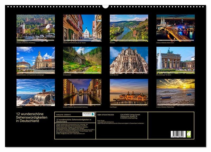Angesagte Städte, wunderschöne Plätze und einzigartige Landschaften, die touristisch zu den beliebtesten in Deutschland gehören und jedes Jahr neue Besucherrekorde verzeichnen können. Für diesen Kalender hat der Fotokünstler Peter Roder zwölf wunderschöne Aufnahmen beeindruckender Sehenswürdigkeiten zusammengestellt und gestaltet, ein farbenprächtiger Hingucker für das ganze Jahr.